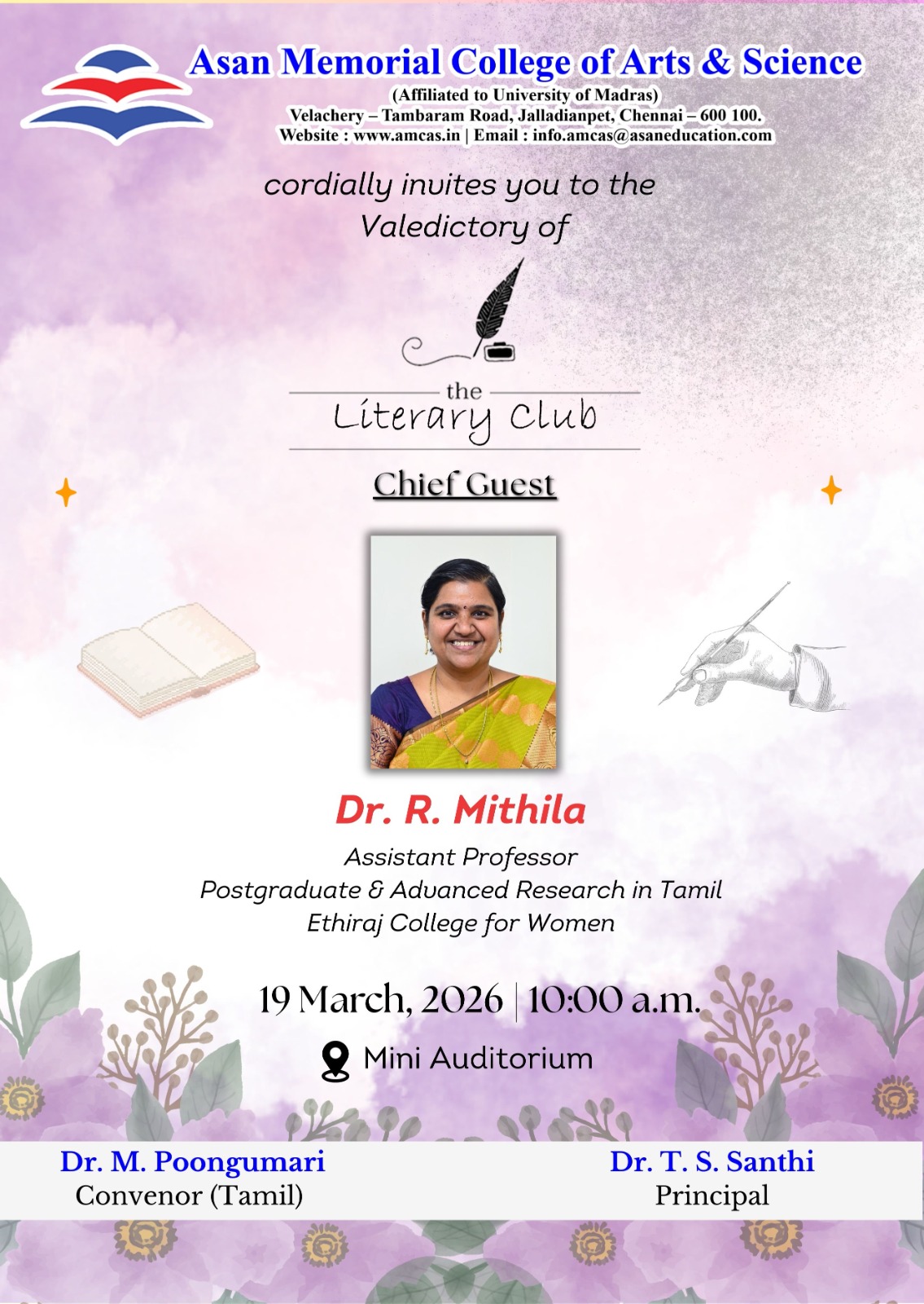 - The NSS Unit of Asan Memorial College of Arts and Science, Chennai, has organised a Seven Days special camp on the topic *Healthy Youth For Healthy India* from 23.03.2023. An Awareness Rally on *Drug Abuse* was organised from Medavakkam village to Pallikaranai on 25.03.2023 (third day of the camp). Around 100 NSS volunteers participated in the rally. Dr. T. S. Santhi, Principal, Asan Memorial College of Arts and Science, presided over the camp. The NSS Programme Officers, Dr. P. Ramesh Kumar and Dr. S. Senthil Kumar coordinated the event.