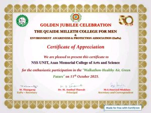 NSS Programme officer and 50 NSS Volunteers of Asan Memorial College of Arts and Science have participated in the Environment Awareness (Healthy Air, Green Future) Walkathon from Kamarajapuram Bus Stop to Quaide Milleth College for Men, Medavakkam, Chennai on 11.10.2025.