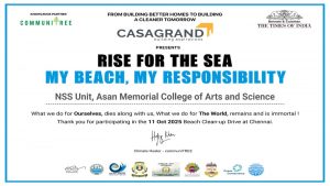 NSS Programme officer and 50 NSS Volunteers of Asan Memorial College of Arts and Science have participated in Mass Beach Cleanup Drive at Neelankarai Beach, Chennai on 11.10.2025.