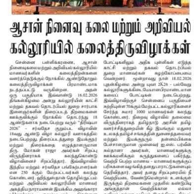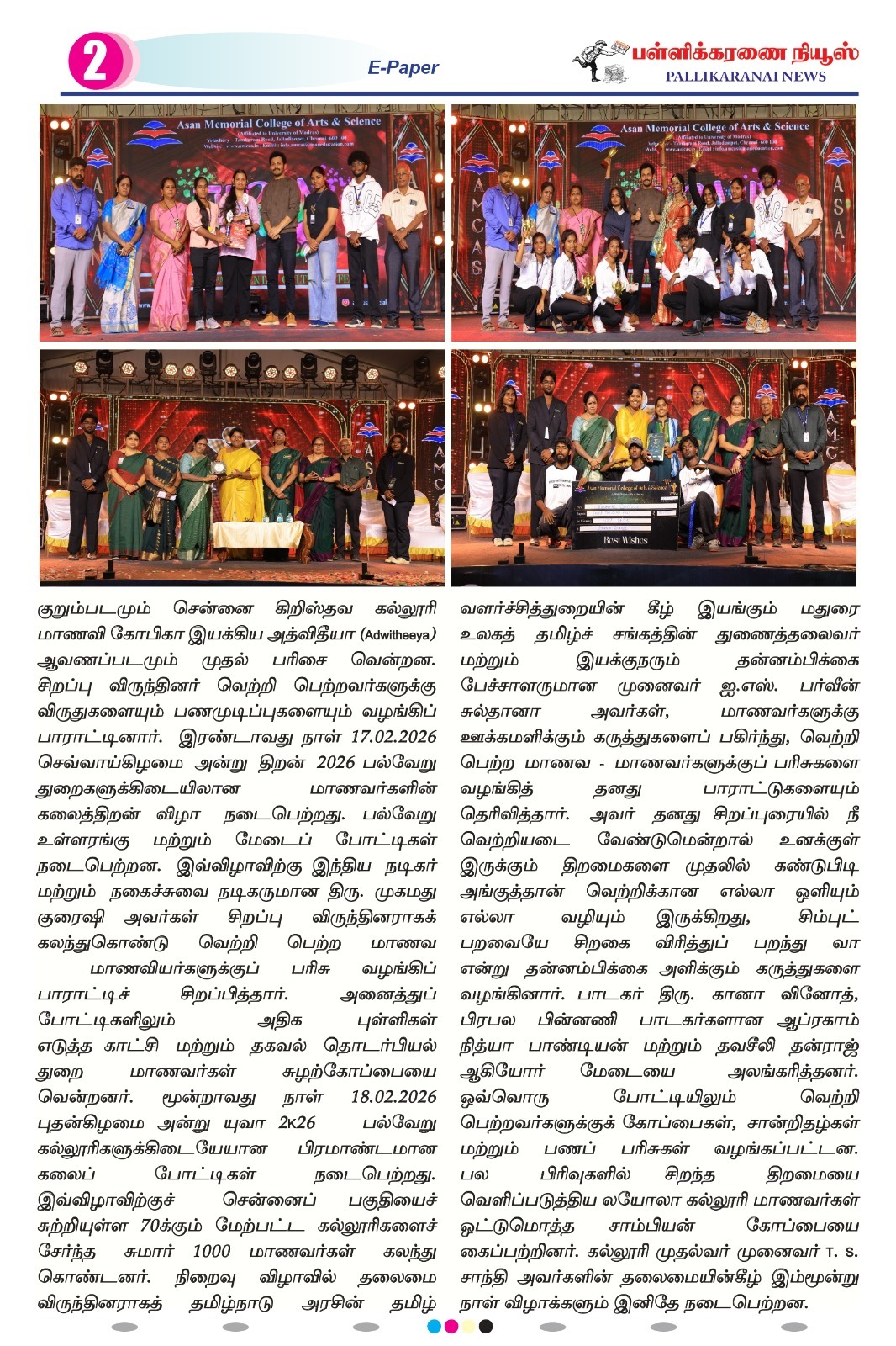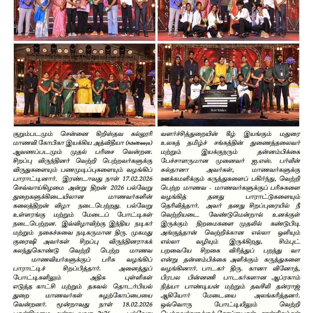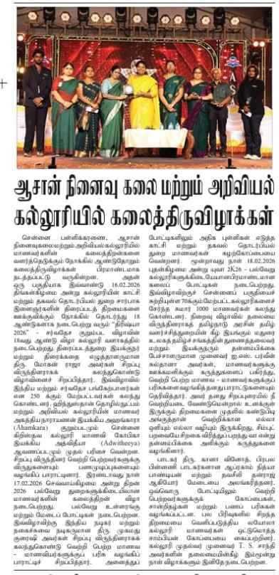 Yuvaa 2026, the annual mega inter-collegiate cultural festival of Asan Memorial College of Arts & Science, Jalladianpet, took centre stage on 18 February 2026. Students from more than 70 institutions throughout the city participated in different activities and performances at the event. In a variety of challenges, both on and off stage, the competitors displayed their abilities and creative brilliance in areas such as dancing, music, fireless cooking, bridal walk, and more. Participants gave their all during their performances, enthralling the audience with their enthusiasm.