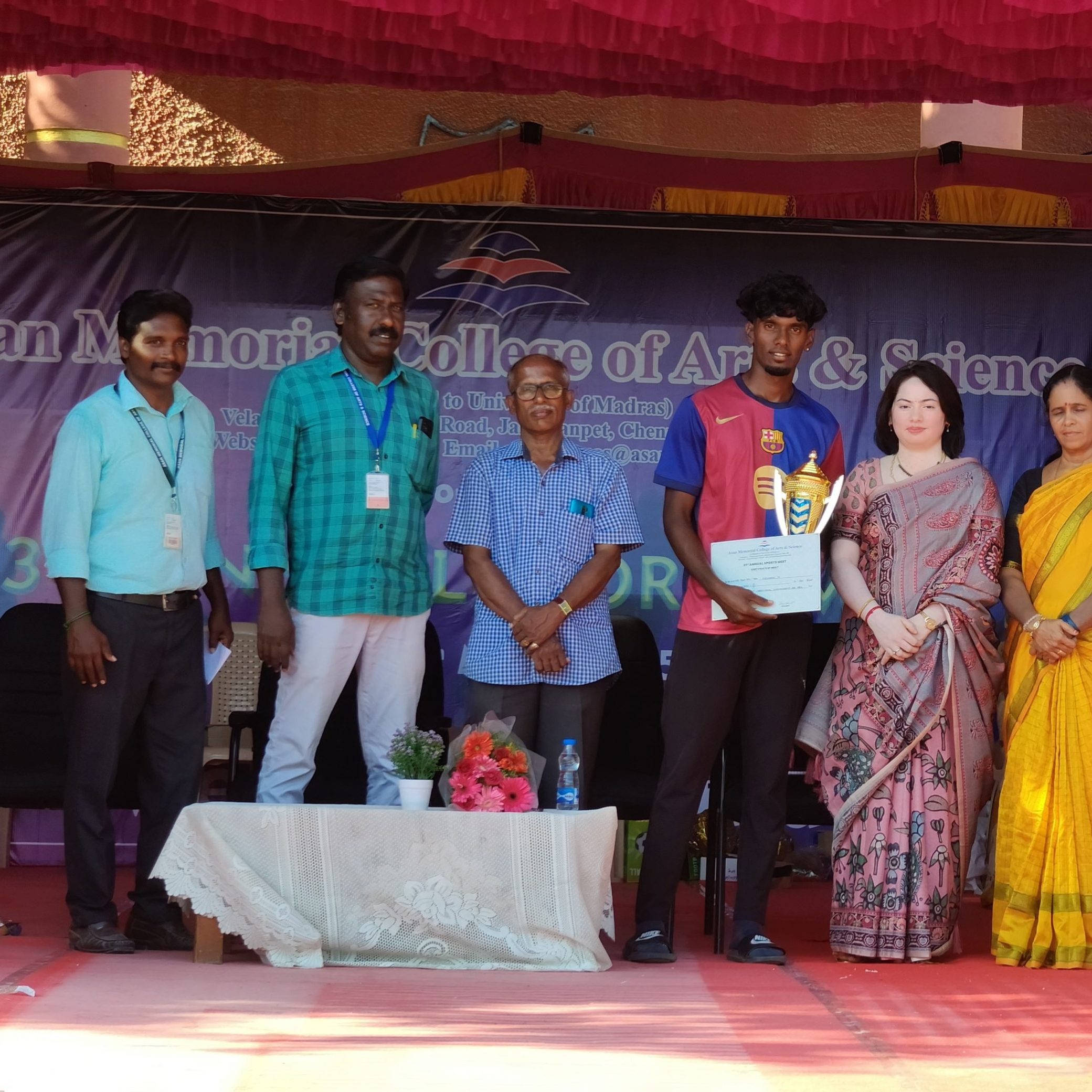 The 17th Annual Asan Memorial of Arts & Science Intercollegiate Volleyball & Football Tournaments were organised on 19th &20th March, 2024 in the college campus. 30 teams of players from various city colleges participated enthusiastically in the matches. The team from Hindustan College bagged the shield in Volleyball against Gurunanak College. The Football team from Dr.MGR Educational & Research Institute won the championship against Nazareth Colleges of Arts & Science. Dr. T. S. Santhi, Principal, gave away the trophies to the winning teams. Directors of Physical Education, Mr. K.Giridharan and Mr. C. Anandan, coordinated the tournaments.