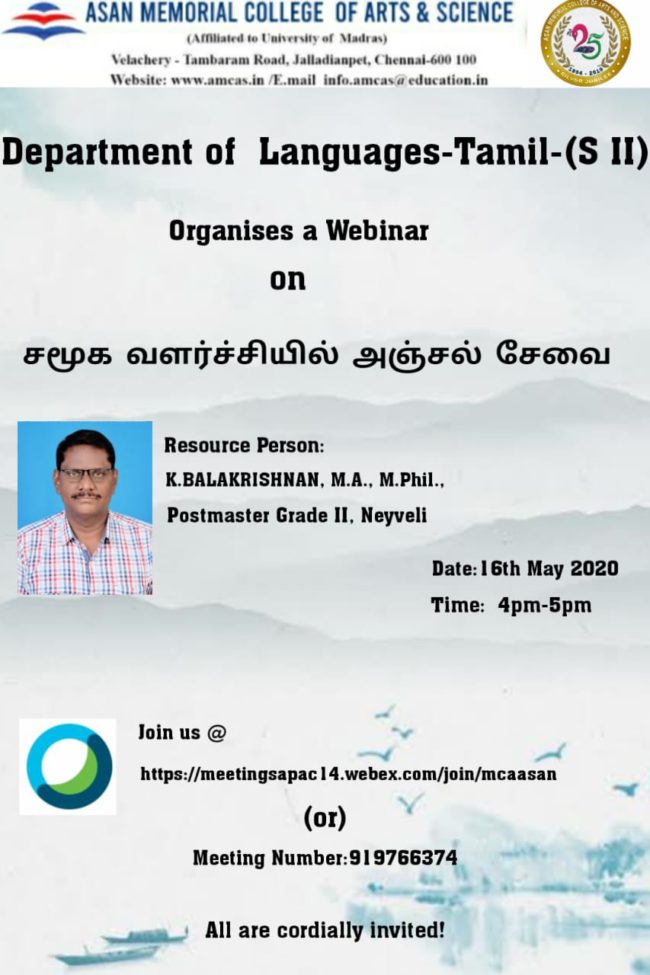 “சமூக வளர்ச்சியில் அஞ்சல் சேவை ” -Webinar organizing by Department of Languages -Shift (II) on 16/05/2020