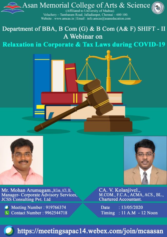 “Relaxation in Corporate & Tax Laws during COVID -19” -Webinar organizing by Department of B.Com (General) & B.Com (A&F) -Shift II on 13/05/2020