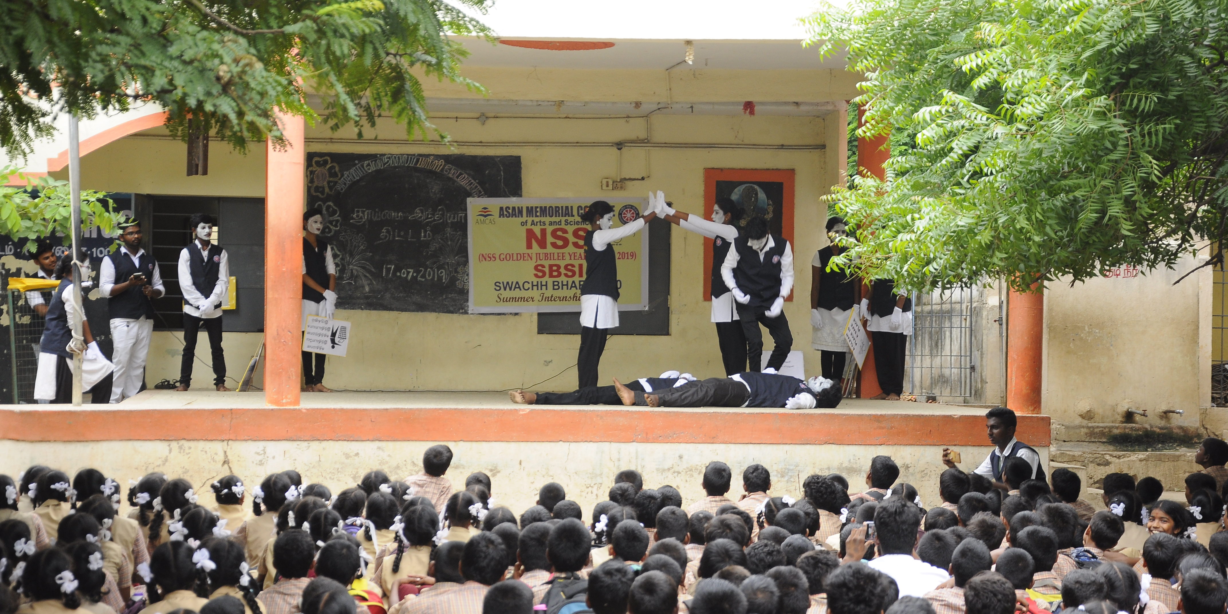 Healthy and clean surrounding helps in the development of mankind, society and a better tomorrow. In this way The NSS unit, Swachh Bharat 2.0 of Asan Memorial College of Arts and Science, Pallikaranai,organised a camp to create awareness on several social issues including the usage of plastics and the importance of rain water harvesting among the people of Pallikaranai and Medavakkam for the past one month. NSS volunteers actively participated in cleaning the the rubbish around panchayat union office, primary health care centre, Government higher secondary school, Medavakkam and Lakshmi Narayana Temple, Pallikaranai. Valedictory function is to be held at Government Higher Secondary School, Medavakkam on 22.07.2019. To create awareness among the school students, NSS volunteers stage a mime show on the necessity of Swachh Bharat and Rain Water Harvesting. Saplings were planted and the wall were painted insisting the importance of Rain Water Harvesting. The camp is headed by Dr. S. Ramanathan, Principal, Asan memorial College of Arts and Science, member – syndicate, University of Madras. The camp is organized by the NSS program officer Dr.P.Ramesh Kumar.