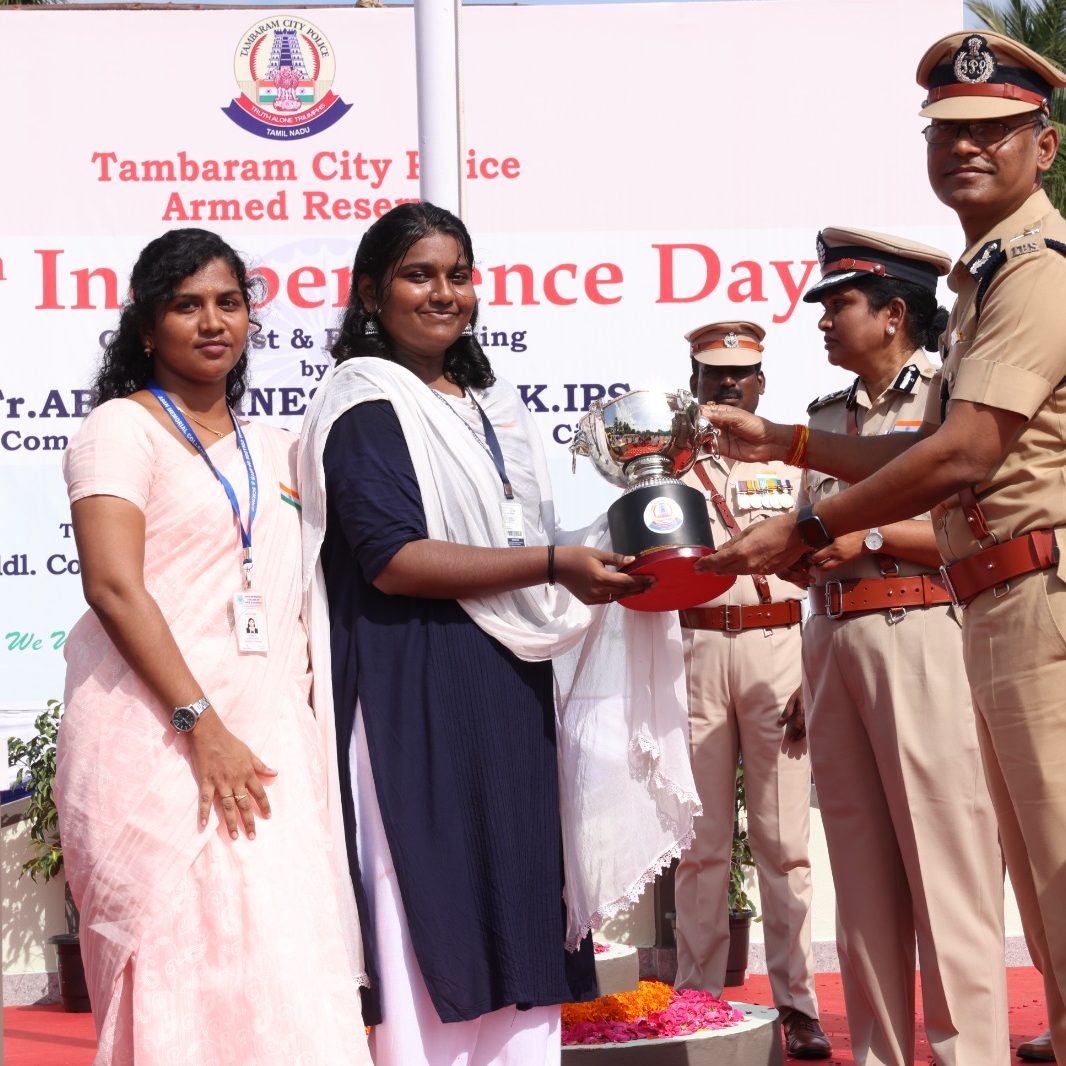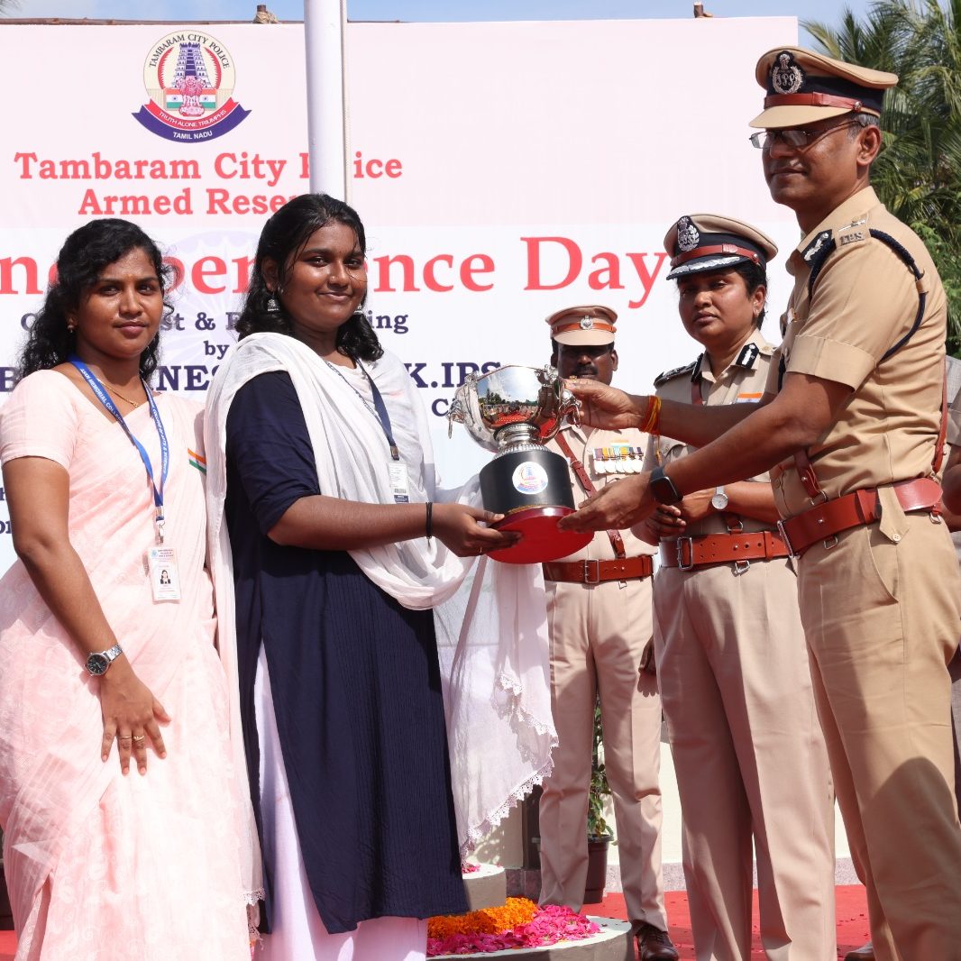 The police Department under government of Tamilnadu and the NSS of Asan Memorial College of Arts and Science conducted elocution competition, on 12/8/2024 in the topic of "Impact and ill effects of drugs on teens. Aishwarya M from the Department of Psychology participated and won the third place. On 15/08/2024, she was accompanied by Ms.Vivega.C Assistant Professor and received the trophy from Tr. Abhin Dinesh Modak, IPS, and the Commissioner of Police (Tambaram) at Paduvanchery Armed Reserve ground. The event began with the Thamizh Thaai Vaazhthu, followed by the AR (Armed Reserve) officers’ parade. Then, the chief guest hoisted the national flag. The special guest Mrs C. Mageshwari, IPS, led us into an oath and the chief guest honoured the winners and runners with the trophies. The event came to an end with the national anthem.