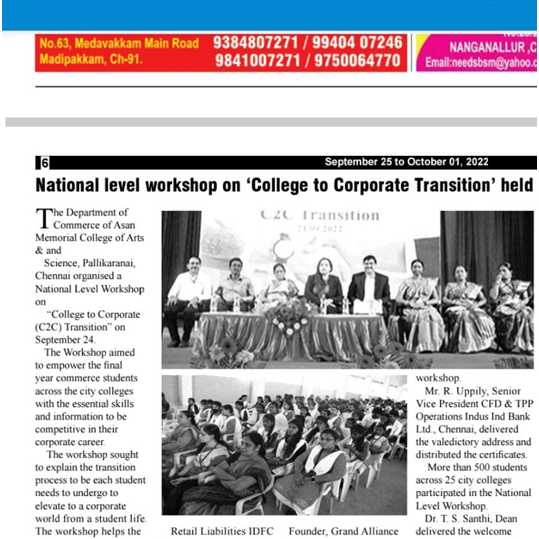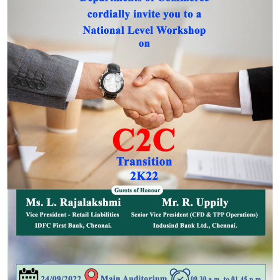 Department of Commerce organised a National Level Workshop on “College to Corporate (C2C) Transition” on 24 th September 2022. The Workshop aimed to empower the final year commerce students across the city colleges with the essential skills and information to be competitive in their corporate career. The Workshop sought to explain the transition process to be undergone by each student to elevate to a corporate world from a student life.