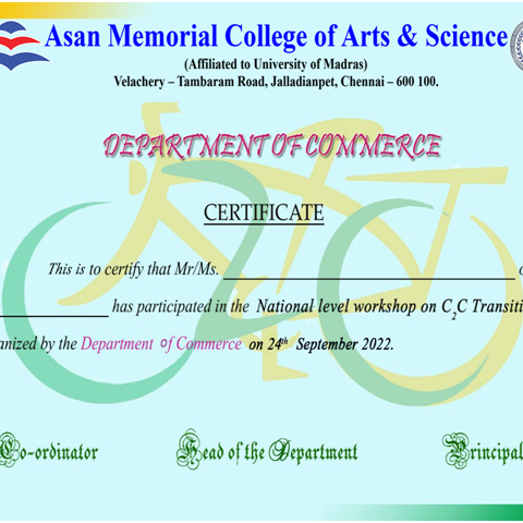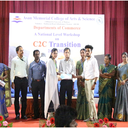 The Department of Commerce took an earnest effort to narrow down the gap between the industry and academia through a National Level Workshop on College to Corporate (C 2 C) Transition workshop. The transformation from the fascinating college life to the demanding corporate expectations is sculptured, smoothened and strengthened through this workshop. It enriches the students to learn the necessary skill sets to confidently face transition which is going to transcend their life.