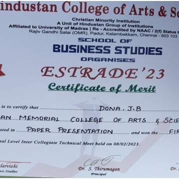 1. Mr. Shiva. V of II B.Com (G) has participated in Paper Presentation in the Signox’23, a symposium organized by Jeppiaar Engineering College on 7th and 8 th September 2023.