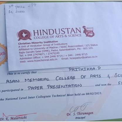 | 15. | Sripradha – III B.Com (C.A.) | Essay Writing – English | Inter- Departmental Competition on Health Awareness – Asan Memorial College Arts & Science | I |