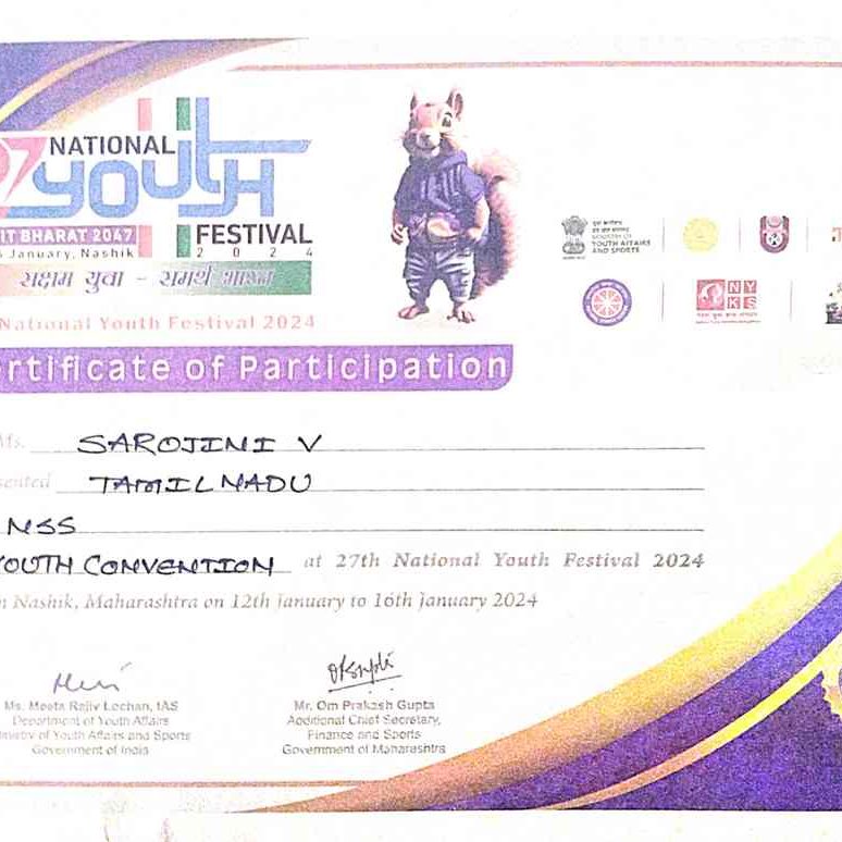 1. A.Boobharathi of II BSc(CS) NSS volunteer of our Department had an interactive session with Smt. Meeta R. Lochan, IAS, Secretary (Youth Affairs) Ministry of Youth Affairs and Sports, Government of India , on the topics of EK BHARAT SHRESHTHA BHARATH (EBSB), SWACHH BHARAT – Clean India activities, FIT INDIA, Environment Awareness Programme, at Anna University, Chennai on December 3, 2022.