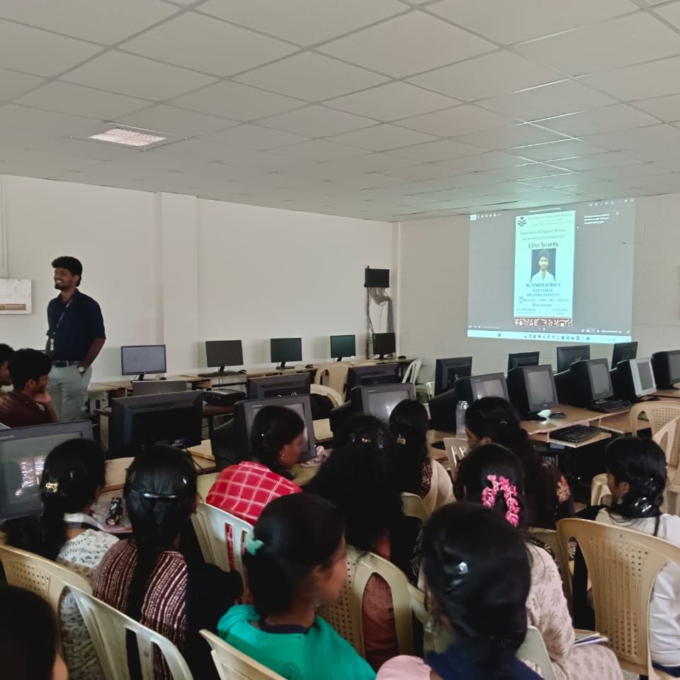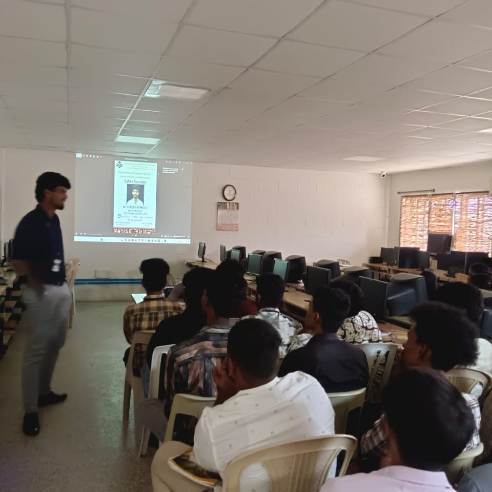 Department of Computer Science organised a Guest Lecture on Cyber Security for BSc Computer Science students on 22nd July 2025. The Resource person is Mr.Vinoth Kumar S, Tech Trainer, FIIT Formacion Pvt., Ltd., Chennai.