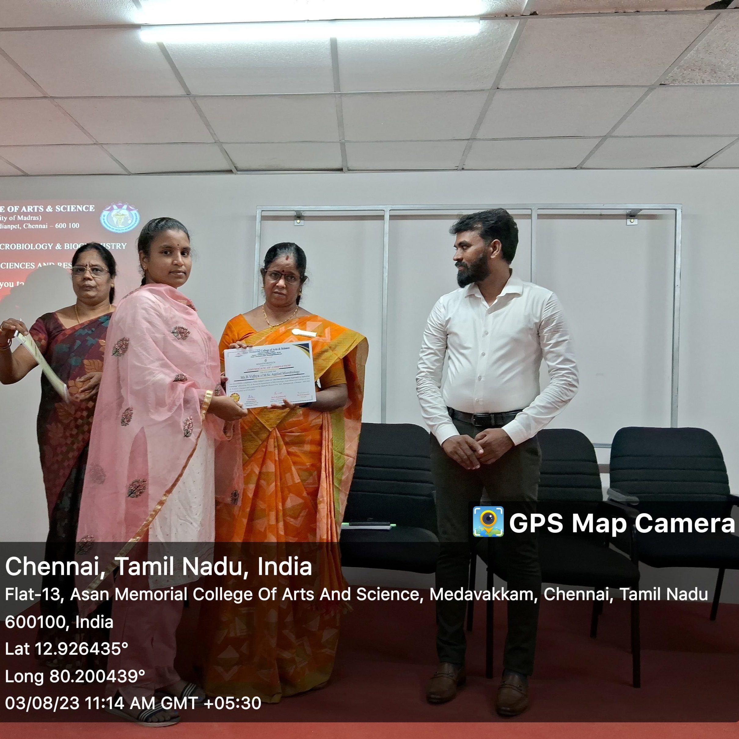 - Eight students of the Department Ms.D.Ahana & Ms.P.Kalpana (I M.Sc Applied Microbiology), Ms.Kiran Srinivasan (III.B.Sc Microbiology), Ms.R.Sheeba & Ms.R.Gayathri (II.B.Sc Microbiology) and Ms.P.Anitha, Ms.S.Jenitha & Ms.S.Logapriyanka (I.B.Sc Microbiology) received the Certificate of Appreciation towards their service as volunteer at the International Seminar in Tamil held on 12.02.2017 at Asan Memorial College of Arts & Science.